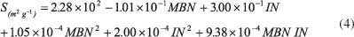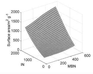 為了描述亞甲基藍和碘的數(shù)量相對于表面積的行為,使用二次模型。對于模型開發(fā),Kennard-Stone算法從105個樣本中選擇了27個樣本并用于校準(zhǔn)。樣品表面積從199到2105 m 2 g -1不等。亞甲基藍的數(shù)量在0到501毫克克每升之間,碘值從155到1670毫克克每升。建模后獲得的表面擬合(圖1)由公式4描述。