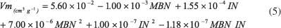 也使用二次模型將微孔體積描述為亞甲藍和碘值的函數(shù)。該模型在總共50個樣本的幫助下構(gòu)建,其中從KS算法中選擇了14個樣本進行校準(zhǔn)。校準(zhǔn)范圍為0.05至0.99cm 3 g -1。從2至427毫克克變化亞甲藍號-1和碘號碼變化從195至1670毫克克-1。建模導(dǎo)致表面擬合(圖3),由公式5描述: