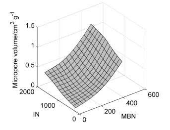 由于微孔由于其尺寸而優(yōu)先被碘分子存取,所以碘值也通過最小二乘回歸與微孔體積直接相關(guān)。然而,所獲得的誤差要高于考慮亞甲藍和碘值時的誤差。這表明亞甲藍在微孔體積預(yù)測中有一定貢獻,可能是由于在較大微孔中的吸附。