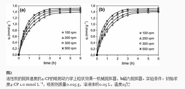 表1中的數(shù)據(jù) 也表明,攪拌速率不僅影響吸附動(dòng)力學(xué),而且影響4-CP從水中的去除效率。吸附容量從1.385增加到1.520 mmol·g -1(機(jī)械攪拌器)和從1.391增加到1.510 mmol·g -1(磁力攪拌器),攪拌速度從100增加到500rpm。觀察到從20.06 4-CP的吸附容量的增加至23.04毫克克-1攪拌速度從300到600轉(zhuǎn)。然而,一些作者已報(bào)道,用增加攪拌速度只能達(dá)到一定的限度,超過(guò)此有在吸附容量無(wú)顯著增加吸附增加。在一些情況下,觀察到在更高的攪拌速率在吸附容量的降低。正如作者所提出的,這是由于這樣一個(gè)事實(shí),即在非常高的攪拌速度下,吸附分子和吸附劑顆粒的動(dòng)能增加到足以使它們相互碰撞而導(dǎo)致分離松散結(jié)合的吸附分子。