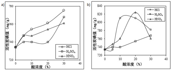 圖1:酸的濃度對活性炭碘值的影響,在(a)18°C和(b)50°C下進行酸洗化學(xué)活化。