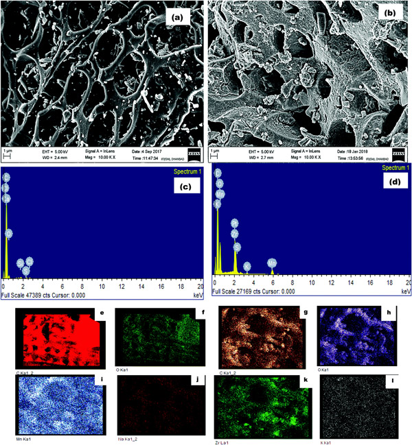 圖2:(a)活性炭和(b)載鋯活性炭的微觀形態(tài),(c)原始和(d)ZrAC的EDX光譜以及活性炭(e和f)和載鋯活性炭(g–l)的元素圖。