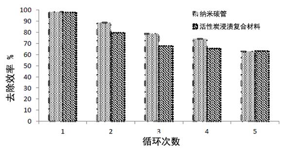 活性炭復(fù)合材料的再生具有經(jīng)濟重要性。該實驗涉及許多吸附-解吸循環(huán),以估計重復(fù)脫色對納米材料吸附效率的影響。發(fā)現(xiàn)納米碳管和活性炭浸漬材料對活性紅的去除效率略有變化,如圖3所示。數(shù)據(jù)顯示原始納米碳管和活性炭浸漬材料存在差異與不同初始活性紅染料濃度下重復(fù)使用的納米化合物相比;钚约t的吸收程度在第一個循環(huán)后達(dá)到98.18%,然后在五輪納米碳管后降低到62.72%,而對于活性炭浸漬材料,第一個循環(huán)去除效率為97.72%,在第一個循環(huán)后,在五輪后降低到63.18%,表明其再生有效性,如圖3所示。因此,可以得出結(jié)論,納米碳管和活性炭浸漬材料的吸附過程會受到延長重復(fù)使用周期的影響,而不會損失大量染料吸附能力。因此,兩種納米化合物被多次用于從水性階段去除活性紅染料。因此,這表明它們可以多次使用,證明了它們的經(jīng)濟可行性。