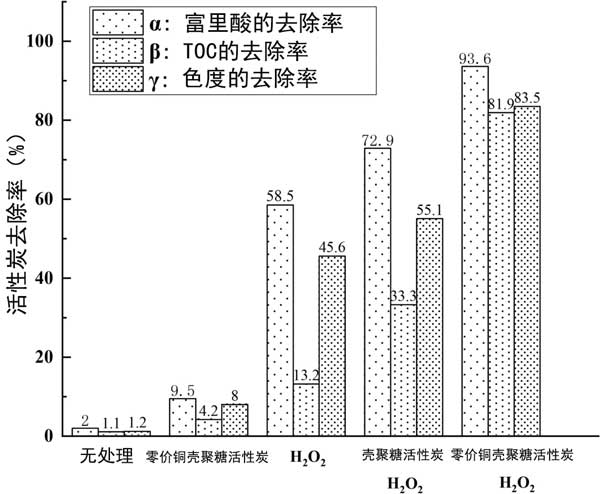 富里酸、TOC、色度的去除率分別以α、β、γ表示,如圖2所示 。從圖中可以看出,氧化劑H 2 O 2 的加入是至關(guān)重要的。實(shí)驗(yàn)組用H 2 Ø 2倍加有較好的去除富里酸,TOC和色度相比,有活性炭催化劑的組比沒(méi)有催化劑的組實(shí)現(xiàn)了更高的去除率。三個(gè)指標(biāo)的去除率都有所提高,尤其是TOC的去除率明顯提高,從13.2%提高到81.9%,說(shuō)明零價(jià)銅的加入可以大大提高催化濕氧化法反應(yīng)中富里酸的礦化率。相同條件下,礦化率比無(wú)零價(jià)銅實(shí)驗(yàn)組高近2.5倍。零價(jià)銅對(duì)富里酸降解和脫色也有明顯效果。結(jié)果表明,本研究制備的零價(jià)銅殼聚糖活性炭催化劑對(duì)富里酸去除和有機(jī)化合物礦化具有較高的催化活性。