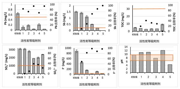 圖2:活性炭等吸附劑的篩選。廢水中污染物的數(shù)量顯示在主y軸上的列中,污染物減少量顯示為次要y軸上的黑點。橙色線是水道排放的限值。
