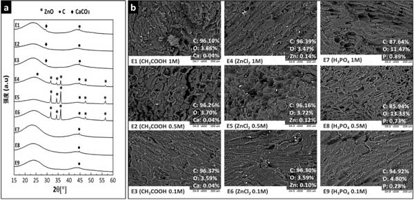 活性炭的X射線衍射圖如圖1-a所示。峰值在2θ=44在所有衍射圖中觀察到的6°歸因于對(duì)應(yīng)于石墨(00-001-0646)的(101)平面。與其他材料不同,活性炭的衍射圖也顯示在2θ=26.4°歸因于石墨(00-001-0646)的(002)平面。ZnO和CaCO3可能是在熱處理過程中作為原材料組分和活化劑之間二次化學(xué)反應(yīng)的產(chǎn)物或由于前體中固有的殘留礦物質(zhì)含量而產(chǎn)生的。經(jīng)過掃描電鏡分析500倍的SEM顯微照片如圖1-b所示。觀察到所有活性炭都表現(xiàn)出異質(zhì)表面形態(tài),其由不規(guī)則形式的成組薄片組成。在用ZnCl2活化的碳的表面上觀察到與氧化鋅相對(duì)應(yīng)的沒有特定形狀的白色小顆粒(通過XRPD分析證實(shí))。此外,EDS分析顯示存在分散在整個(gè)表面的碳(C)、氧(O)和鋅(Zn),從而證實(shí)了ZnO顆粒分散在這些吸附劑的表面上。