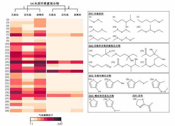 圖2:(a)在未處理和處理過的兩種木質(zhì)素混合物中檢測到的含硫氣味劑氣味稀釋因子的彩色差異和(b1-b5)硫氣味劑的結(jié)構(gòu)式根據(jù)其化學(xué)結(jié)構(gòu)分為亞組數(shù)字(2-44)是指氣味的連續(xù)順序。