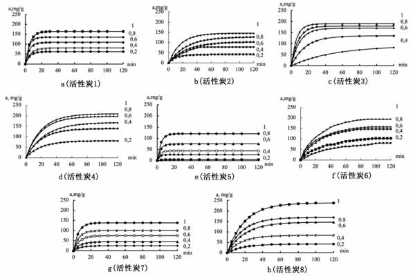 根據(jù)多種測(cè)試獲得植物廢活性炭技術(shù)指標(biāo)除中,活性炭1、2對(duì)于正丁醇的去除效果比較好,3、4、5對(duì)碘和苯的吸附能力非常好,盡管其余的活性炭具有良好的能力,但是為了和專(zhuān)用活性炭的吸附性能做比較,選擇了植物廢料活性炭1和2。為了比較評(píng)估使用通過(guò)上述化學(xué)活化從植物廢料中獲得的活性炭在幾乎相同的條件下從其VMA中提取揮發(fā)性有機(jī)溶劑蒸氣的可行性,以實(shí)驗(yàn)室生產(chǎn)的正丁醇蒸汽和活性炭的使用為例,研究了這些過(guò)程的動(dòng)力學(xué)和平衡。
