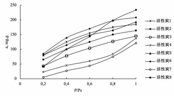 來(lái)自植物廢料的活性炭中,活性炭的K值表示吸附劑的吸收能力的最高值,活性炭2的最佳值是由于微孔體積大。表征煤與丁醇相互作用的能量的模型參數(shù)n是活性炭的最小參數(shù)。這對(duì)應(yīng)于最凸的吸附等溫線(圖2),這有利于捕獲低濃度的丁醇蒸氣。就活性炭3而言,除活性炭4外,所有活性炭均優(yōu)于活性炭5,與活性炭2相當(dāng)。根據(jù)極限飽和值,由圖1和圖2中的動(dòng)力學(xué)曲線證明。如圖1所示,繪制了相應(yīng)的吸附等溫線(圖2)。