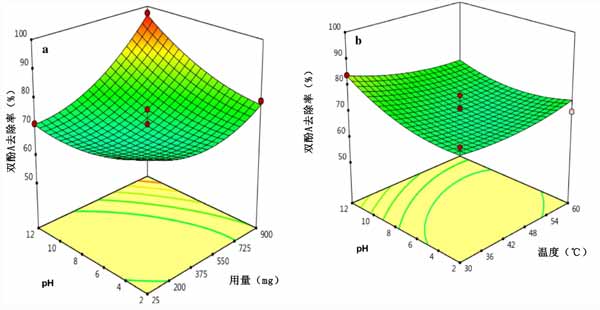 圖3:雙酚A去除效率對(duì)磁力活性炭影響的響應(yīng)面3-D(a)pH和劑量以及(b)pH和溫度。