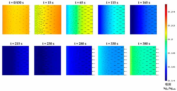 活性炭復(fù)合吸附劑的壓力和溫度決定了平衡吸收,它代表了在給定時間分別在吸附和解吸階段可以達到的最大和最小吸收容量。然而,顆粒內(nèi)和顆粒間的傳質(zhì)阻力表明吸附材料在每種給定情況下可以多快達到其平衡吸收能力。這突出了在本研究中同時求解兩種傳質(zhì)機制與其他控制方程的重要性,以顯示促進傳熱對傳質(zhì)的凈效應(yīng)。圖2顯示了在430秒循環(huán)時間內(nèi),考慮到預(yù)熱和預(yù)冷階段均為30秒的時間間隔內(nèi)代表性部分的固結(jié)吸附劑域的溫度分布。