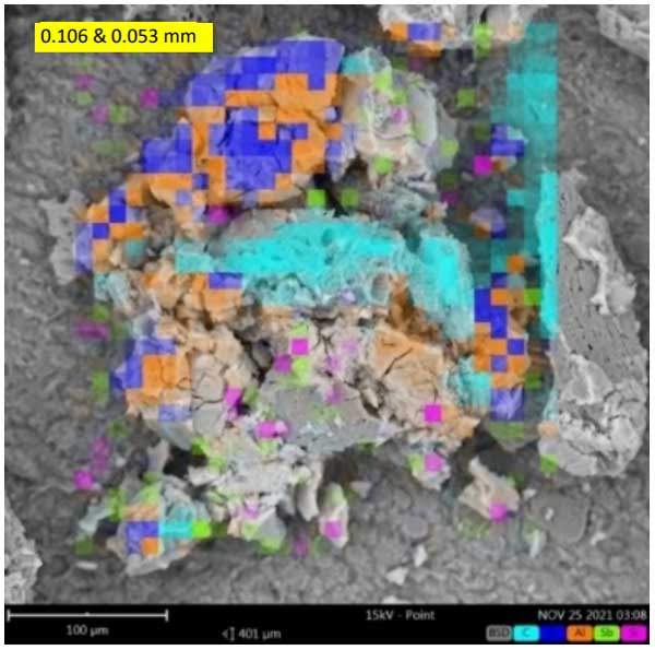 不同尺寸活性炭顆粒中電凝的結(jié)果如圖2所示,它是在EDS函數(shù)中使用SEM進(jìn)行的,它非常精確地說明了不同尺寸顆粒的聚集,被EDS函數(shù)顯示為鋁-氧的物質(zhì)包圍藍(lán)色和橙色,而在淺藍(lán)色的中心,它顯示了碳,作為一個整體,根據(jù)比例,一個尺寸接近400微米的活性炭和Al(OH)3的凝塊。延長停留時間會增加活性炭對電凝工藝的暴露。測量的pH值是用過的水的pH值,電極由鋁制成,在這些測試中表現(xiàn)最好。如上所述,電流密度取決于施加的電壓、介質(zhì)的電導(dǎo)率以及電極的類型和距離。在電凝過程結(jié)束時電極質(zhì)量的退化作為參數(shù)進(jìn)行監(jiān)測。結(jié)果表明,當(dāng)電流密度和停留時間增加時,電極退化程度越高。第3階段測試顯示零重量損失,表明活性炭顆粒是固定的。大量凝塊與最終體重的增加直接相關(guān)。在測試中,最終重量分別比初始重量高出174%和107%,分別是因?yàn)殇X從水性介質(zhì)中沉積出來并且活性炭凝結(jié)。