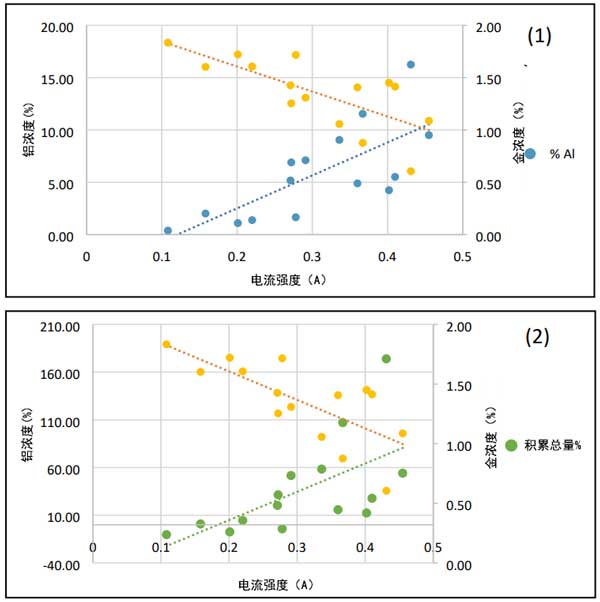 圖3:電流強(qiáng)度與鋁和金濃度(1)的關(guān)系圖,以及電流強(qiáng)度與總累積重量和金濃度(2)的關(guān)系圖。