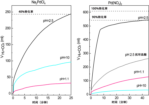 兩種不同的Pd前驅(qū)體在不同浸漬pH下制備的活性炭催化劑在60℃時產(chǎn)生的重整氣體(H2+CO2)的體積隨時間的變化曲線圖在圖2顯示。由于甲酸鈉添加劑對甲酸脫氫的促進作用,催化測試在存在的情況下進行]。所有制備的樣品都顯示出研究反應(yīng)的活性。正如在當(dāng)前測試條件下所預(yù)期的,曲線的形狀遵循甲酸中的一級動力學(xué)。為了更好地理解析氫曲線,我們測量了不同階段的反應(yīng)pH值:分散催化劑和甲酸鈉在60℃攪拌30分鐘后,注入甲酸后,當(dāng)反應(yīng)開始時和使用Na2PdCl4制備的催化劑系列反應(yīng)25分鐘后和Pd(NO3)2系列反應(yīng)40分鐘后,根據(jù)圖7所示的曲線。表明在所有樣品的反應(yīng)過程中,甲酸+甲酸鈉緩沖液的初始pH值保持不變,除了使用Pd(NO3)2制備的樣品,在pH值2.5下浸漬并用銻還原。對于該樣品,反應(yīng)40分鐘后的pH值為8.2,表明緩沖條件的喪失和甲酸的總消耗量與實現(xiàn)的90%甲酸轉(zhuǎn)化率一致。對于該系列的其余部分,pH測量值表明甲酸并未完全消耗,這與實現(xiàn)的轉(zhuǎn)化率一致。