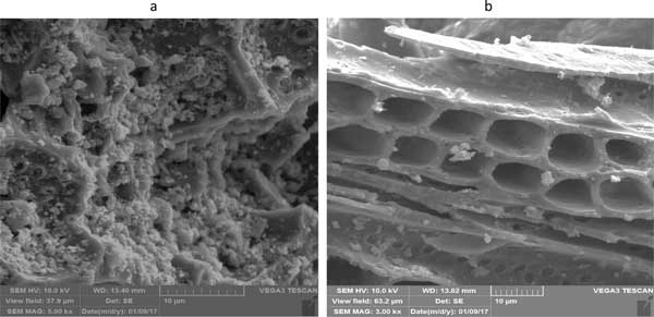 如前所述,通過(guò)掃描電子顯微鏡(SEM)評(píng)估了未提取和提取的活性炭樣品的結(jié)構(gòu)和表面形態(tài)。圖3a、b顯示了活性炭在超臨界再生之前(a)和之后(b)的兩張顯微照片。未處理樣品的顯微照片顯示不均勻且粗糙的表面均勻覆蓋有一層溶質(zhì)。由于用超臨界二氧化碳萃取獲得的高回收效率,處理過(guò)的樣品的結(jié)構(gòu)更加多孔,表面明顯收縮并耗盡溶質(zhì)。