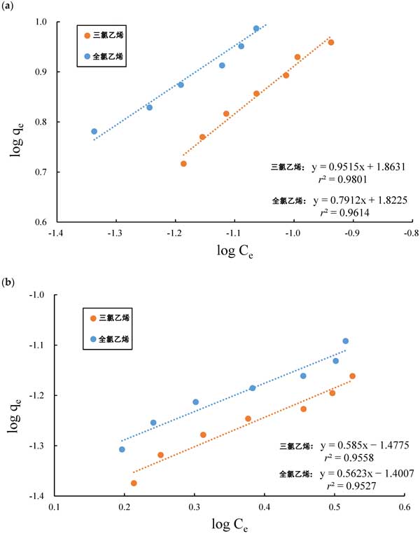 圖3:(a)活性炭和(b)硅膠吸附到氯代有機(jī)化合物上的實(shí)驗(yàn)數(shù)據(jù),符合Freundlich等溫線的線性形式。