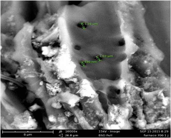 由于上述陶瓷膜去除污染物的多重優(yōu)勢和有前途的特性,分析陶瓷膜中不同活性炭和氧化鐵粉末含量的影響。使用掃描電子顯微鏡研究活性炭材料的微觀結(jié)構(gòu)。圖1描繪了使用ZnCl2/50vol%在10,000倍放大倍數(shù)下活化后的活性炭的孔隙。發(fā)現(xiàn)活性炭的孔徑顯示尺寸范圍在0.93μm–1.26μm之間。