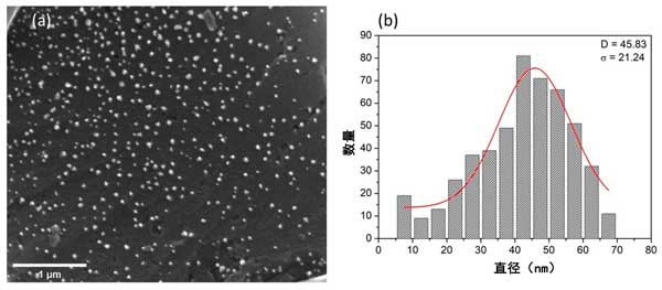 圖2:具有1微米比例尺的SEM圖像顯示納米粒子在活性炭上的均勻分布(a)以及通過對活性炭混合納米雜化材料的SEM直方圖進(jìn)行高斯擬合獲得的尺寸分布(b)。