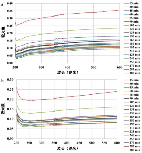 圖3:活性炭1(a)和活性炭2(b)活性炭懸浮液在不同波長(zhǎng)下的吸光度。