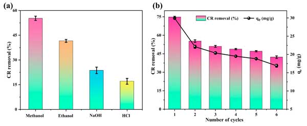 圖4:(a)使用不同的解吸劑后,cr的活性炭的吸附效率;(b)甲醇在六個連續(xù)吸附-吸附周期內通過甲醇的吸附效率。