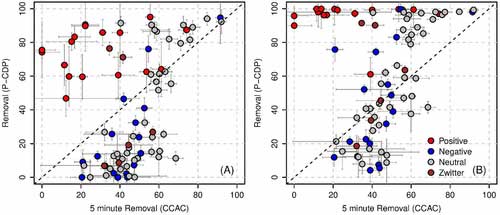 圖2.比較在(A)等效質(zhì)量基礎(chǔ)和(B)等效表面積基礎(chǔ)上進(jìn)行的批量實(shí)驗(yàn)測(cè)量的每種微污染物與P-CDP或活性炭接觸5分鐘后的百分比去除率。每個(gè)面板中的誤差線代表五次測(cè)量的標(biāo)準(zhǔn)偏差。顏色表示在進(jìn)行實(shí)驗(yàn)的pH(pH = 7)下微污染物的電荷狀態(tài)。