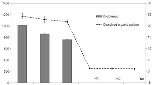 使用活性炭除去雙氯芬酸鈉是定性高效的,通過零吸收和低濃度的DOC的,并且在通過所獲得的色譜中沒有檢測(cè)到雙氯芬酸鈉。得在所研究的處理階段中,在活性炭上的吸附導(dǎo)致最顯著的雙氯芬酸鈉去除。因此,雙氯芬酸鈉沒有水樣中的這個(gè)階段(LOD之后檢測(cè) = 2 μg L−1)?紤]到所述方法的定量限為3 μg L−1,通過活性炭除去雙氯芬酸鈉的至少99.7%。因?yàn)闆]有研究活性炭的破裂曲線,所以活性炭的結(jié)果可以被認(rèn)為是定性的。然而,為了研究在大型水處理廠中去除雙氯芬酸鈉,必須改進(jìn)該方法以達(dá)到較低的檢測(cè)限(約μg L−1)。