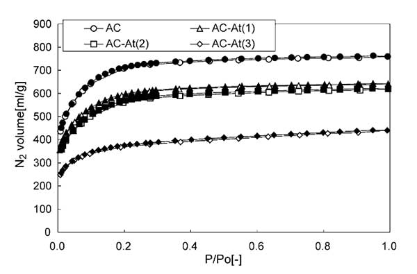 測(cè)量BET比表面積通過(guò)獲得的N2吸附/解吸等溫線確定。根據(jù)BJH方法進(jìn)行中孔比表面積和尺寸分布的估計(jì)。通過(guò)滴定法估算活性炭上酸性基團(tuán)的量。甲基硫醇的吸附通過(guò)分批方法進(jìn)行。將20mg活性炭置于由聚甲基丙烯酸甲酯制成的0.85×10-3 m 3的圓柱形容器中。將容器壓力降至1mmHg以下后,將N2中的甲硫醇加入容器至大氣壓。甲硫醇的吸附量由甲硫醇的濃度隨時(shí)間的變化確定。通過(guò)氣相色譜法測(cè)定甲硫醇的濃度。