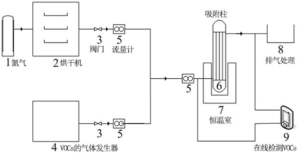 在吸附柱中研究了活性炭吸附甲苯的能力。活性炭的用量為10g,吸附質(zhì)甲苯氣體由氣體發(fā)生器產(chǎn)生。通過測定吸附前后甲苯的濃度,得到了不同條件下活性炭吸附性能的數(shù)據(jù)。實(shí)驗(yàn)吸附裝置的流程圖如圖2所示。將來自氣體發(fā)生器的甲苯氣體與氮?dú)饣旌,然后將其吸附在恒溫吸附塔中。通過在線FID檢測器測量吸附前后的甲苯含量,并通過流量計(jì)控制甲苯流量。當(dāng)脫氣和入口濃度在30分鐘內(nèi)保持一致時,認(rèn)為已達(dá)到吸附平衡。吸附氣體通過廢氣出口排空。