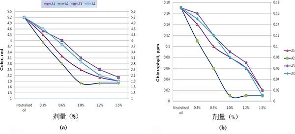 吸附劑的量是漂白過程中最重要的因素。圖3中所示的吸附劑用量的幾種活性炭和漂白土的效果。結(jié)果清楚地表明,活性炭樣品A2在1%吸附劑用量下達到最佳值,吸附劑用量的進一步增加對其沒有顯著影響。這可以通過吸附平衡在吸附劑/油混合物之間達到最大值的事實來解釋。然而,通過在漂白過程中增加其它吸附劑A1,A3和A4的數(shù)量來增加顏色吸收,并且1.5%地球樣品A4顯示與1%活性炭樣品A2相同的結(jié)果。圖3b顯示當使用漂白土和活性炭漂白葵花籽油時劑量對葉綠素減少的影響。該圖還表明吸附劑A2對顏色去除的影響比其它的更為有效。