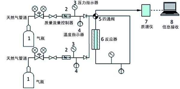 在我們之前的工作中開發(fā)了吸附裝置來(lái)測(cè)量氣體穿透曲線(圖1)。它由三個(gè)主要部分組成:準(zhǔn)備部分、吸附段和分析部分。在氣體制備部分中,吹掃氣體是高純度Ar氣體(99.999%),其用于在引入烴氣體之前通過(guò)惰性氣體管線和反應(yīng)器吹掃系統(tǒng)。吸附部分使用丙烷或乙烷在氦氣或人造氣體混合物,其通過(guò)燃料氣體管線和反應(yīng)器。這兩條線都碰到了一個(gè)四端口交叉閥。整個(gè)裝置等溫(~26℃)。閥門位置,氣體流量,壓力和溫度完全自動(dòng)化,并由內(nèi)部程序控制。通過(guò)質(zhì)譜儀分析和量化來(lái)自反應(yīng)器出口的氣體。