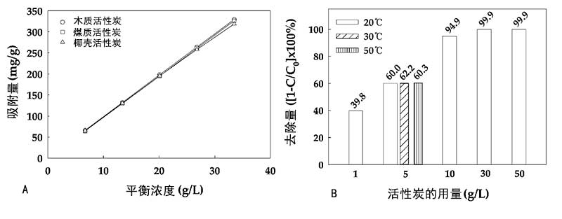 圖3:(A)作為平衡濃度的吸附量取決于不同類型的活性炭,(B)活性炭的含量對(duì)去除效率的影響。