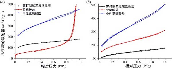圖1顯示了活性炭在-196℃的氮?dú)馕降葴鼐和孔徑分布及其紋理特征。從看到的圖1中,活性炭的吸附等溫線在很大程度上受到制漿工藝的類型的影響。但是使用蘇打制漿黑液作為前體從活性炭獲得的等溫線遵循I型吸附等溫線;钚蕴康牡赵诜浅5偷南鄬毫ο侣晕⒃黾樱S后在平臺(tái)形式中略微吸附增加,相對壓力增加至1,表明存在微孔性。但是,來自亞硫酸鹽的中性亞硫酸鹽制漿的活性炭的等溫線提供了I型和II型的吸附等溫線,這反映在碳結(jié)構(gòu)中存在一些中孔。