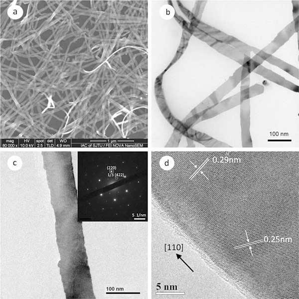 圖1顯示了在活性炭上生長的銀納米帶的典型電子顯微鏡(EM)圖像。SEM圖像(圖1a)顯示獲得了豐富的線狀產(chǎn)物,具有非常少的準(zhǔn)球形顆粒雜質(zhì)。圖1b是銀納米帶的典型TEM圖像。該圖中所示的納米帶的平均寬度為約45納米。從左側(cè)附近的扭曲納米帶測(cè)量的厚度為約9納米。位于TEM網(wǎng)格上的這種平坦且光滑的納米結(jié)構(gòu)也通過右側(cè)的莫爾圖案來證實(shí),其源自具有不同晶體取向的兩個(gè)或三個(gè)納米帶的堆疊。圖1c呈現(xiàn)單個(gè)納米帶的TEM圖像。其選擇區(qū)域電子衍射(SAED)圖案插入右上角,具有六重對(duì)稱性。