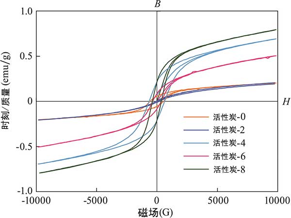 活性炭的磁滯回線如圖3所示。隨著鐵含量增加,活性炭的飽和磁化強(qiáng)度首先降低并隨后增加;钚蕴康娘柡痛呕瘡(qiáng)度值與活性炭中殘留的四氧化三鐵和金屬鐵的量有關(guān),因為它們具有磁效應(yīng);钚蕴康奶囟ù呕适谴欧蛛x的重要參數(shù)之一。