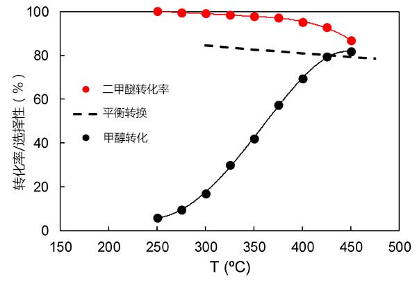 圖3:溫度變化對(duì)甲醇轉(zhuǎn)化率和二甲醚的選擇性影響。