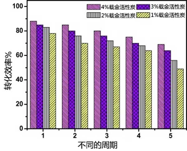 為了量化活性炭載金催化劑的催化活性,可以使用轉(zhuǎn)換頻率作為度量。轉(zhuǎn)換頻率可以定義為使用每克活性炭每單位時(shí)間轉(zhuǎn)化成產(chǎn)物(對(duì)氨基苯酚)的反應(yīng)物分子(對(duì)硝基苯酚)的數(shù)量。活性炭載金催化劑是可回收的,每次運(yùn)行后,通過(guò)離心分離催化劑。即使使用5次,催化劑的轉(zhuǎn)化率最多降10%。這通過(guò)繪制百分比轉(zhuǎn)換效率與循環(huán)次數(shù)來(lái)顯示,如圖3示。