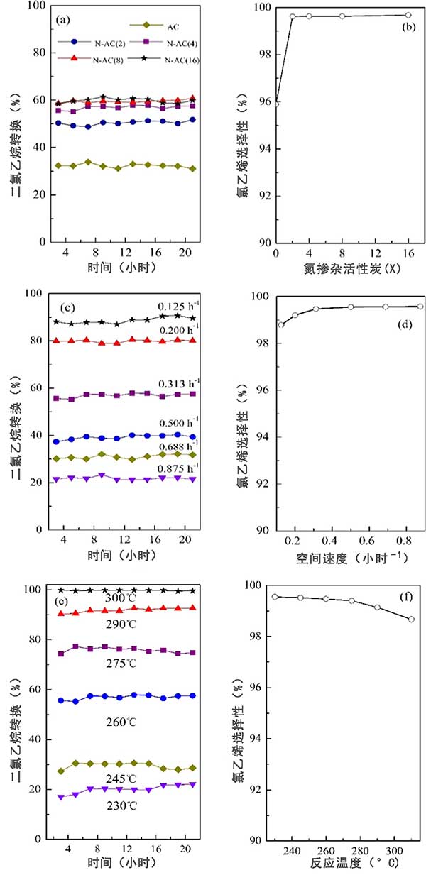 c、顯示出二氯乙烷轉(zhuǎn)換為初始?xì)涞囊话,而氯乙烯選擇性是在任何時(shí)候都在99%以上。結(jié)果表明氮摻雜活性炭催化劑具有良好的穩(wěn)定性。