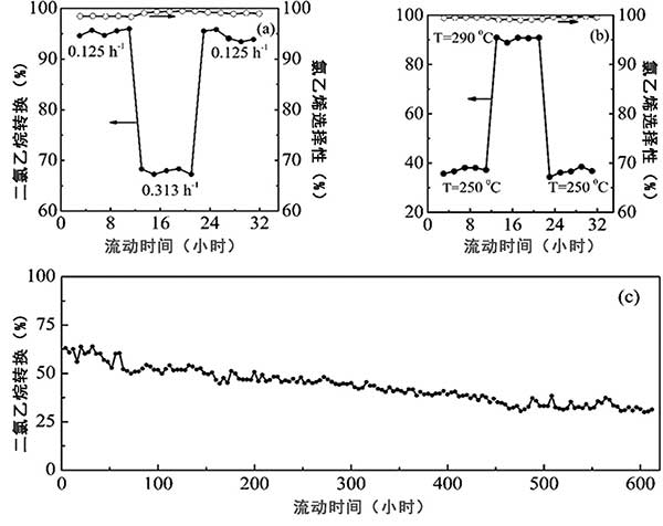 a、顯示了二氯乙烷液時(shí)空速對(duì)260℃反應(yīng)溫度下氮摻雜活性炭穩(wěn)定性的影響。同時(shí),氯乙烯選擇性在整個(gè)過程中是一致和穩(wěn)定的。