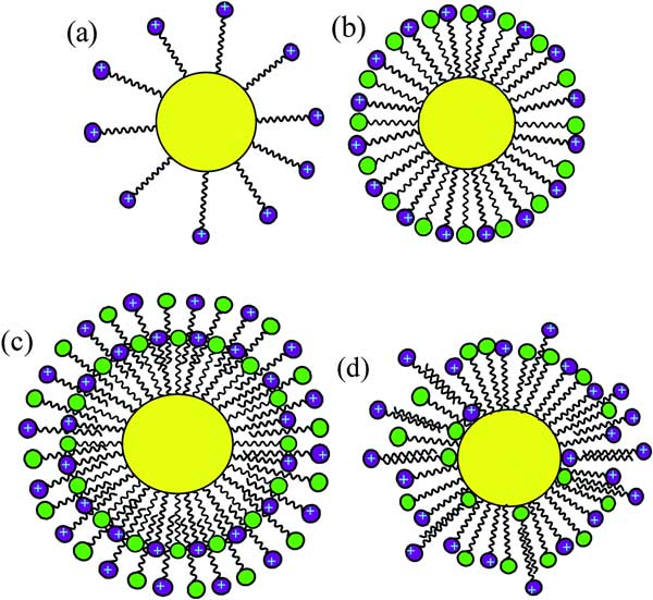 圖2:(a)銨活化劑,(b)兩種活化劑在低濃度單層(半纖維素)形式的活性炭顆粒表面上的排列,(c)滲透,(d)高層混合雙層濃度。