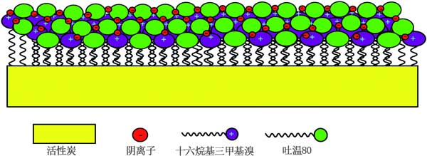 用表面活性劑改性的活性炭在電吸附過程中具有潛在的應(yīng)用,其中表面電荷和潤濕性起重要作用。用離子表面活性劑功能化的活性炭電極最近在電容去離子技術(shù),特別是反向電容去離子系統(tǒng)中引起了相當(dāng)大的關(guān)注。圖3表明在用吐溫80和HDTMA的二元混合物改性的活性炭上吸附陰離子。吐溫80的存在表明HDTMA的吸附密度增強(qiáng),完美填充(高穩(wěn)定性),這在電吸附過程中都是值得的。實(shí)際上,HDTMA的增強(qiáng)的吸附密度誘導(dǎo)了陰離子污染物的高吸附能力。此外,改進(jìn)的填料賦予表面活性劑在表面上的穩(wěn)定性。這些特殊效果是混合表面活性劑體系應(yīng)用的最終目標(biāo)之一,為了提高活性炭的表面活性,對(duì)于單一表面活性劑體系來說,這是不可能發(fā)生的。