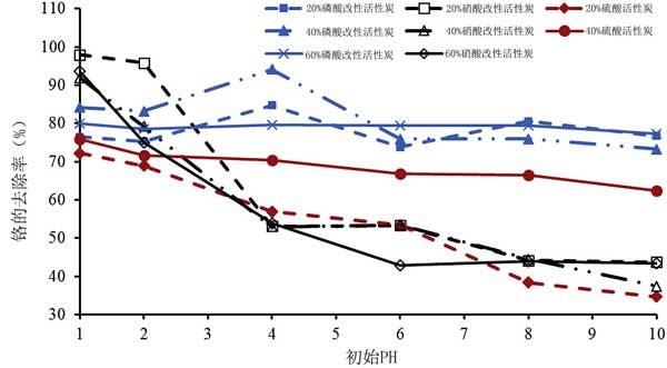 對鉻實現有效吸附所需的較高劑量可能意味著用硝酸,硫酸對活性炭進行化學氧化和磷酸除去吸附位點。具體地,當考慮所用的劑量和初始濃度時,硫酸和磷酸改性產生的活性炭與沒改性的相比具有較差的性能。因此,基于使用不同前體的研究,不能推廣酸改性對活性炭性能的影響。對于不同濃度硫酸磷酸改性和20%硝酸改性活性炭,在pH 1下各種吸附劑的處理能力都超過75%最大的硝酸改性活性炭達到了98%,而磷酸改性活性炭的那些性能最大?偟膩碚f,20%硝酸改性的活性炭才是去除鉻的最佳吸附劑。