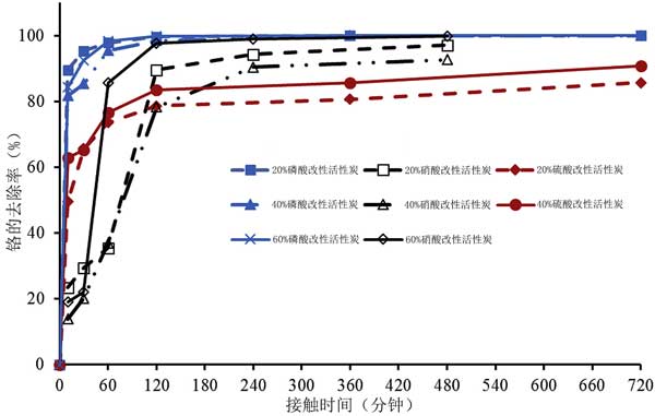 吸附物與活性炭的接觸時間對吸附效果的影響很大,在接觸過程中鉻的去除從0到10分鐘急劇增加,然后從10分鐘減慢到120分鐘,最終在硫酸改性的吸附劑中從120到720分鐘達到平衡。用磷酸改性的吸附劑觀察到相同的趨勢,但是在60分鐘時更早達到平衡,而對于硝酸改性活性炭,平衡似乎在240和480分鐘之間達到。去除百分比沒有明顯差異從120到720分鐘。除了更快的去除動力學之外,磷酸改性的吸附劑顯示出比硫酸和硝酸改性的對應物更高的去除百分比,從0到120分鐘。據預測,無機酸在浸漬過程中會穿透活性炭孔隙,一旦加熱到高溫,它們就會通過孔隙與萃取劑一起逸出,留下互補的孔隙。留下的通道通過與所得官能團的物理和化學相互作用幫助吸收吸附物。出于均勻性原因,選擇12小時并用作后續(xù)實驗的最佳時間。