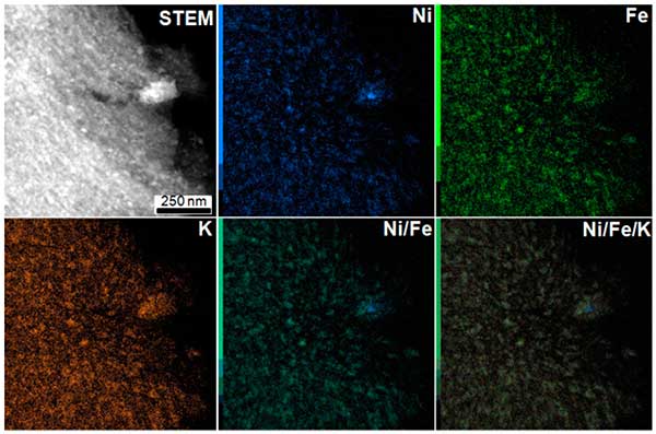 圖2:活性炭負(fù)載過(guò)渡金屬鎳材料的EDX圖譜,顯示了納米粒子中鎳,鐵和鉀的存在。