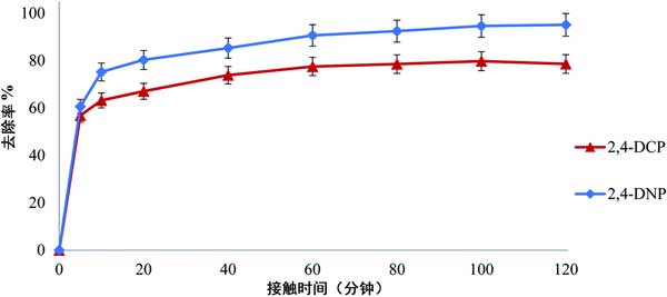 圖3:接觸時(shí)間對(duì)去除2,4-DNP和2,4-DCP的影響。