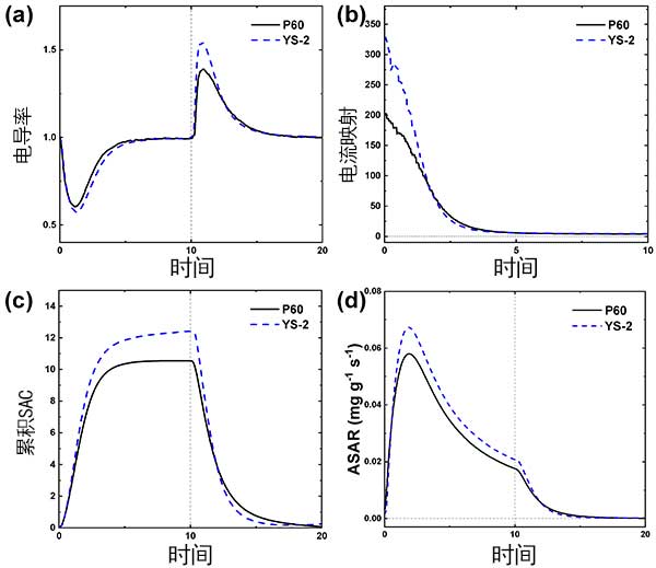 圖2以(a)歸一化電導(dǎo)率曲線表示使用疏水和親水活性炭電極的電容去離子性能。如圖2a所示,在充電步驟期間,與疏水活性炭電極相比,歸一化電導(dǎo)率在親水活性炭電極的情況下顯示出更低和更寬的下降。對于親水活性炭電極,在充電步驟開始時(shí),圖2b中所示的特定電流也顯得較高。圖2的a,b在電容去離子表明更多離子在充電步驟中的初始幾分鐘吸附在親水活性炭電極的表面上。這意味著在親水活性炭電極上可以更快,更高地吸附鹽?梢酝茢啵捎谒肿痈菀走M(jìn)入微孔,因此親水活性炭電極上離子的可及表面積大于疏水活性炭電極上的離子的可及表面積。