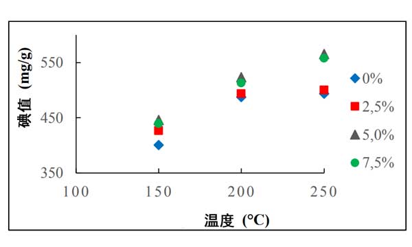 從圖1可以看出,熱解溫度具有增加活性炭和木炭的碘值的作用,因?yàn)樗黾恿藷峤夥磻?yīng)器中的壓力,從而促進(jìn)了碳鏈的斷開。這也導(dǎo)致了轉(zhuǎn)移碳的數(shù)量增加。會在熱解過程中誘發(fā)碳?xì)浠衔锖推渌袡C(jī)化合物的分解。此外,它增加了木炭和活性炭孔的表面積。