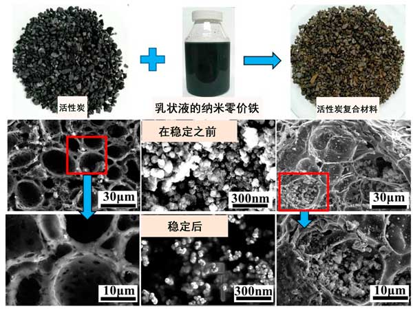 將nZVI的乳液與十二烷基苯磺酸鈉和無(wú)水乙醇混合,并在氮?dú)獗Wo(hù)下在機(jī)械分散器中分散12小時(shí)。分散后,依次將100 mL乳液,200 g 活性炭和200 mL去離子水添加到1000 mL錐形燒瓶中,并在水平振動(dòng)器上以240 rpm的速度震蕩。震蕩12小時(shí)后,用去離子水清洗混合物,并在真空干燥箱中于45°C干燥過(guò)夜獲得。