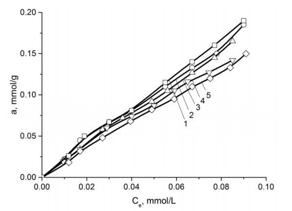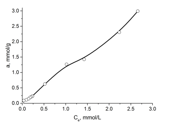 鍶離子的吸附平衡常數(shù)得出吸附平衡常數(shù)等于2,并且ΔG0值分別為0.5 kJ / mol。根據(jù)以前的數(shù)據(jù),活性炭吸附劑-H2O的水界面ΔG0等于2.3 kJ / mol。具有比溶劑(水)低的標(biāo)準(zhǔn)摩爾吸附微分自由能(ΔG0)的吸附劑無(wú)法將其從吸附劑表面(從其孔隙)中置換出來(lái),但是鍶離子在相對(duì)較高的平衡濃度下被吸附,其值這些離子的吸附量相當(dāng)大(圖1)。這種現(xiàn)象可以通過(guò)以下事實(shí)來(lái)解釋:在低平衡濃度下,鍶離子與活性炭的多孔結(jié)構(gòu)中的水分子相互作用,從而形成Sr(OH)+離子;钚蕴课⒖捉Y(jié)構(gòu)中Sr(OH)+的形成和擴(kuò)散過(guò)程已有實(shí)驗(yàn)。在相對(duì)較高的平衡濃度下,水分子不會(huì)因與羧基(-COOH)以及與磷酸鹽和多磷酸鹽基團(tuán)(P = O,COP)相互作用而與活性炭結(jié)合的鍶離子置換。