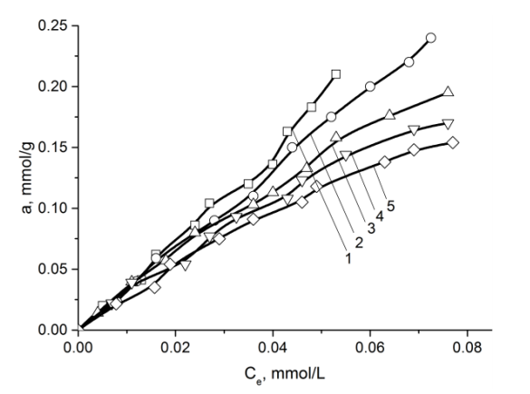 圖3和圖4分別顯示了在不同溫度下,水溶液中鍶離子在果殼1和果殼2活性炭上的吸附等溫線。從提供的數(shù)據(jù)可以看出,隨著溫度的升高,果殼1和果殼2活性炭樣品上的吸附值都在減小,但鍶離子在果殼2上的吸附等溫線的形狀低平衡濃度下的碳與果殼1活性炭上的碳不同。在較高的平衡濃度下,我們還可以區(qū)分出果殼2活性炭樣品上鍶離子吸附等溫線的形狀與果殼1活性炭相比。