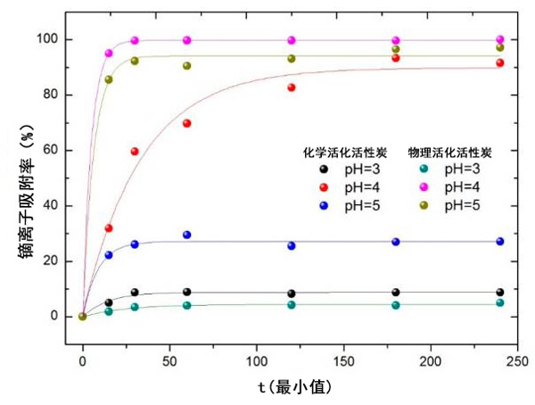 我們系統(tǒng)的研究了三種不同參數(shù)對兩種類型的活性炭吸附能力的影響:溶液的pH值,鏑離子濃度和活性炭量。